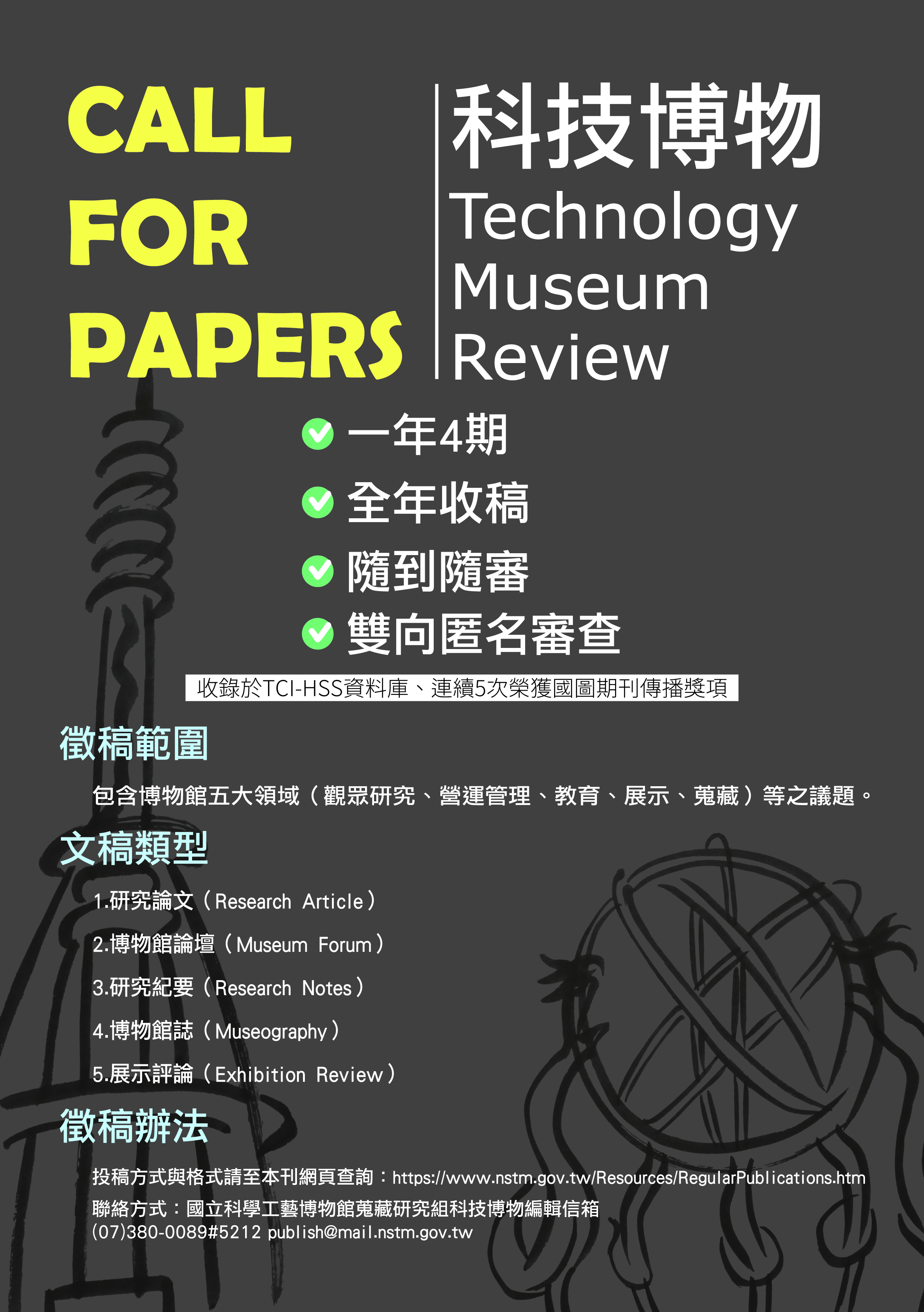 一、科工館《科技博物》為「臺灣人文及社會科學引文索引資料庫」(TCI-HSS)所收錄學術期刊,具雙向匿名審查機制;徵稿範圍包含博物館五大領域研究:觀眾研究、營運管理、教育、展示、蒐藏(蒐藏管理、保存及文化資產理論與實務之研究)等之議題。每年3、6、9、12月各出刊1次,全年徵稿,文稿隨到隨審,歡迎踴躍投稿。